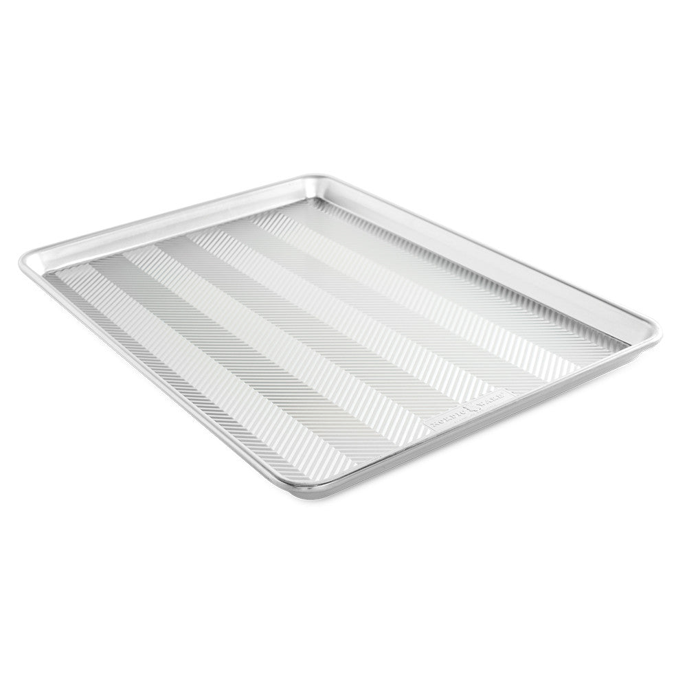 Embossed Natural Aluminum Bakeware enhances the look and performance of our hugely popular baking pans. Exclusive Prism grid adds durability and provides easy release while also improving air flow for uniform crisping. Encapsulated galvanized steel rims prevent warping. Beauty and strength meld with form and function in this oversized baking sheet. Fits most standard ovens.