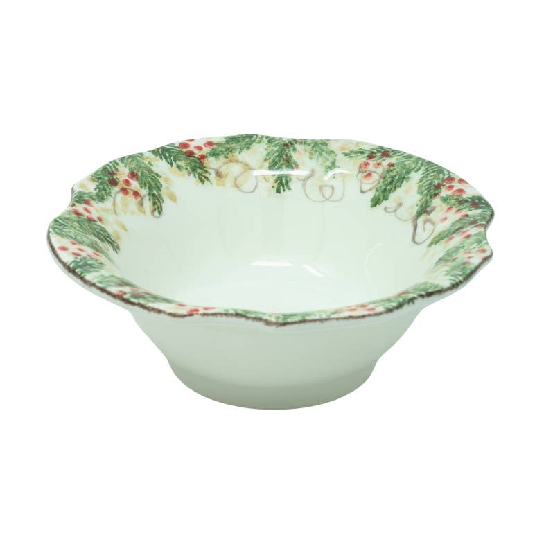 Our best selling Natale Collection is one of the most popular lines in the industry. Festive, yet soft, it features majestic snowy evergreens surrounded by enchanting pine boughs and winterberries. All hand painted, no two pieces are alike. Customers love its "wintery" look, perfect for Christmas celebrations but so beautiful throughout the winter season. Handmade and hand painted in Tuscany. 7"D x 2.5"H