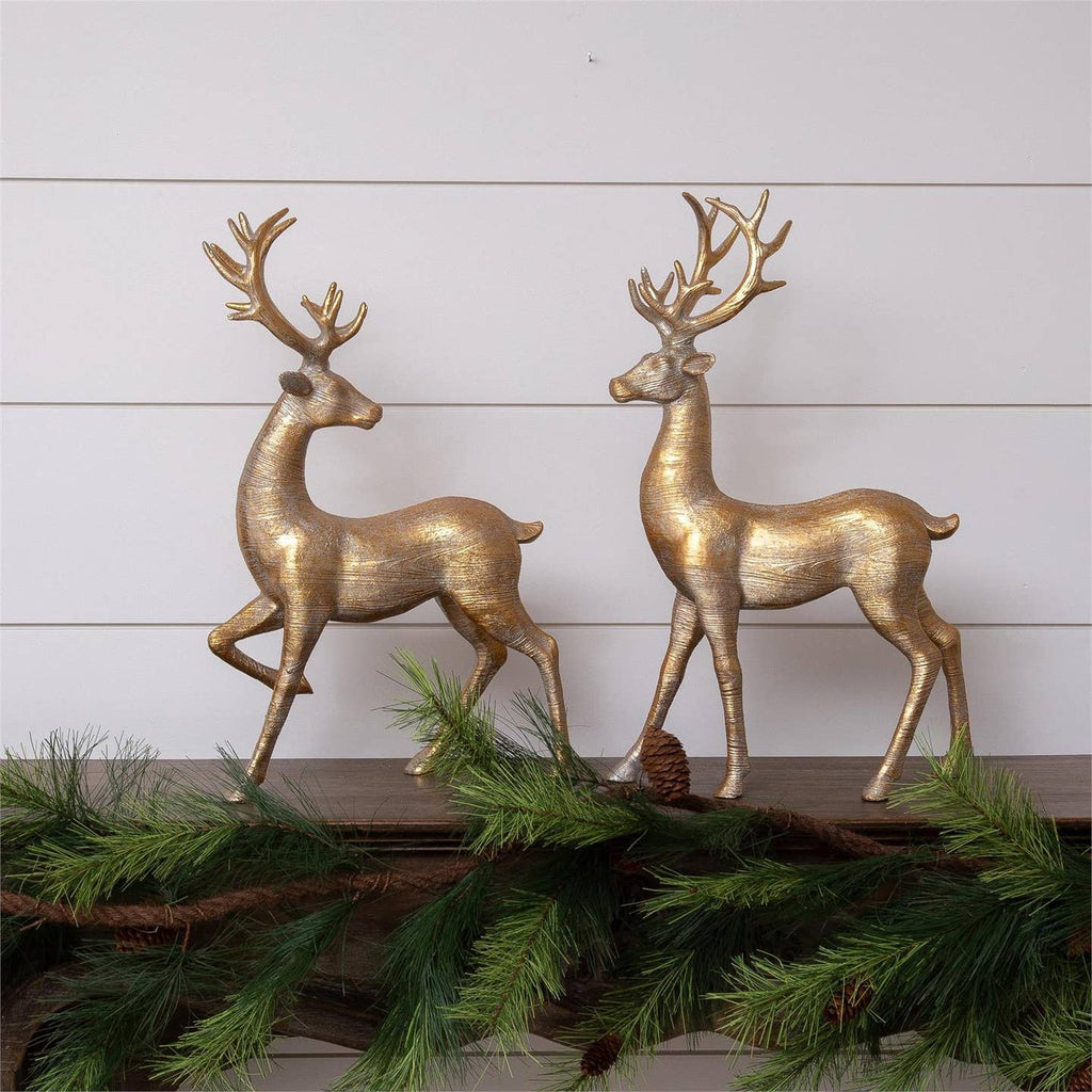 Elevate your seasonal décor with this elegant Gold Shimmer Deer set, featuring two beautifully sculpted figures—one standing tall and the other gracefully lifting a leg. Crafted from a durable blend of polyresin and stone powder, each deer showcases delicate detailing and a shimmering gold finish that catches the light from every angle.