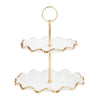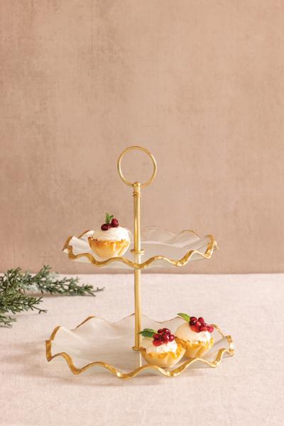 Elevate your entertaining with this elegant two-tier glass server, featuring beautifully textured ruffled edges accented with shimmering gold foil. The center gold-foil metal dowel adds a luxurious touch while providing sturdy support. Designed for easy storage and setup, the server conveniently knocks down when not in use. Perfect for showcasing desserts, hors d’oeuvres, or holiday treats.