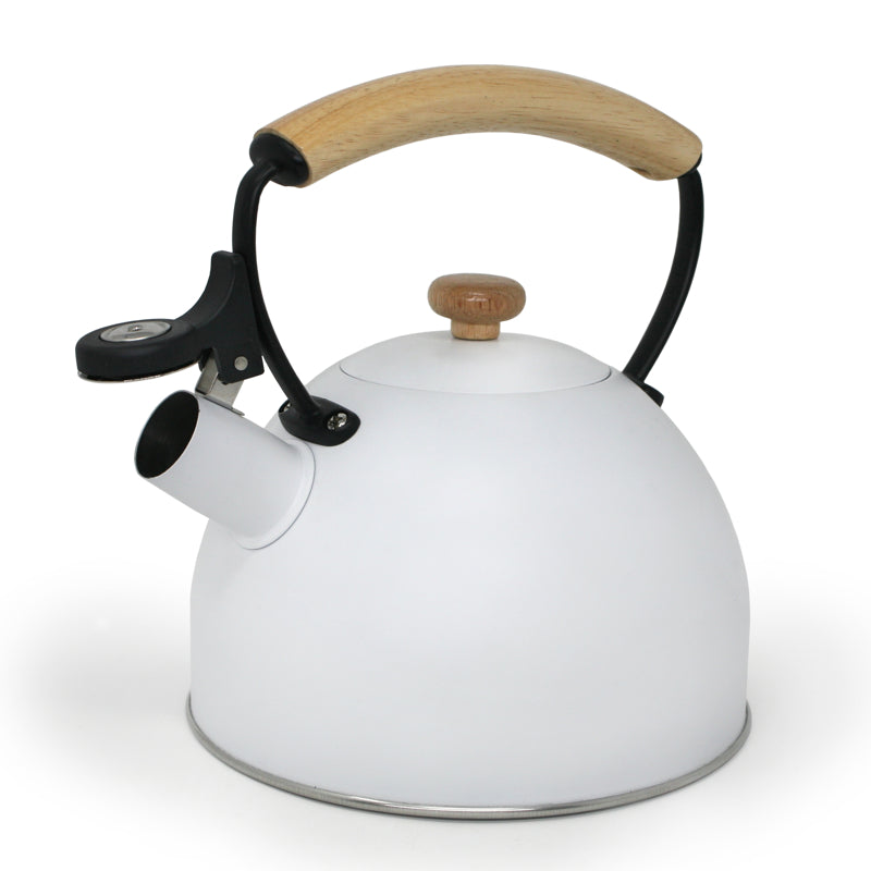 Made of high quality stainless steel, this kettle features a capsulated base which makes it work on all stove tops including induction. It will make a loud whistle once your water is boiled, so you won't ever leave it on the stove for too long, and it's wooden handle and knob stay cool which makes handling it a breeze.