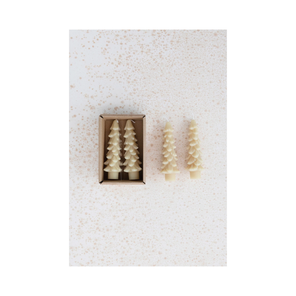 Boxed set of 2 eggnog coloured unscented tree-shaped taper candles; Burn time of approximately 5 hours; Made from 100% Paraffin Wax. Burn time of approximately 5 hours.