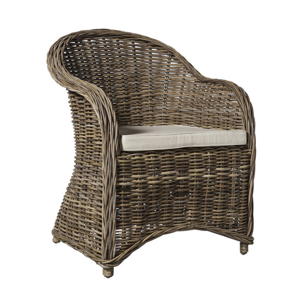 Relax in style with this beautifully crafted rattan arm chair, featuring a natural woven frame and a soft, neutral cushion for added comfort. Its airy design and organic texture bring a laid-back, coastal feel to any indoor or covered outdoor space. Lightweight yet sturdy, it's the perfect blend of comfort and casual elegance.