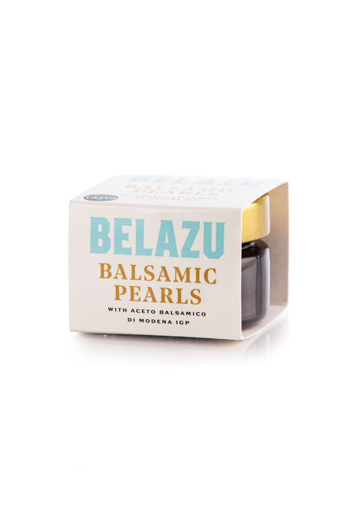 Tiny jelly-enclosed spheres of balsamic vinegar that explode with flavour. The balsamic vinegar within is 1.17 Balsamic Vinegar of Modena, IGP, one of the sharper balsamic, and perfect with all kinds of Mediterranean salads and vegetables.
