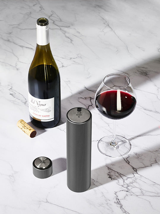 Metalworking has always been inextricably woven into Peugeot's DNA. With its aluminum finish, Line Reverse reflects Peugeot's ability to break new ground by offering a fully automatic rechargeable electric corkscrew with a clearly graphical and contemporary design. Line Reverse is fitted with the latest-generation Li-ion battery for 80 extractions with a single charge and fast charging in 2.5 hours. Corks can be extracted by simply pressing the corkscrew down on the bottle. Once the bottle has been opened, a simple flick of the wrist will eject the cork from the corkscrew. Line Reverse is available here in a carbon finish with a matching foil cutter.