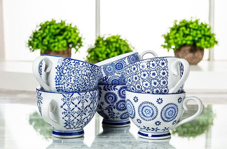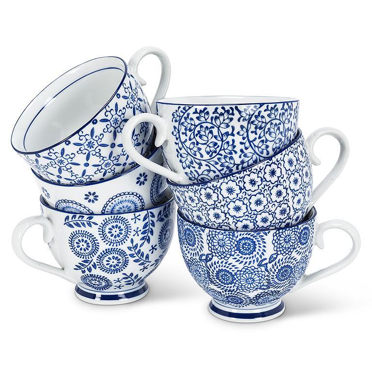 Give your morning coffee or tea a stylish new home with these Indigo collection cups. Made of porcelain with intricate blue and white designs that evoke European tile work and Asian prints, each cup is unique - — a wonderful complement to other pieces from our Indigo Collection. 6 assorted styles.