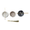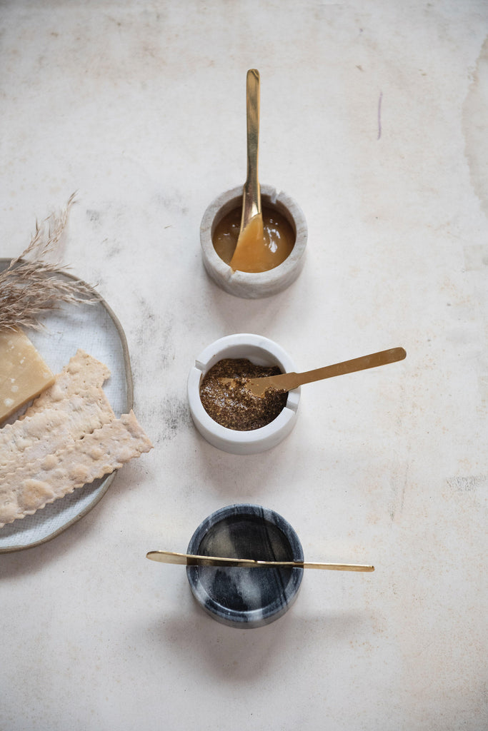 Add elegance and style to your tabletop displays with this eye-catching assortment of serving bowls with knives. Showcasing exquisite artistry, each bowl features marble construction in varied colourings and comes with a stainless steel knife with brass plating. Each bowl has slots to keep the knife in place, making transporting them from kitchen to dining room a breeze. Great for serving dips, relish, condiments, and other tiny snacks, as well as for use as salt and pepper cellars. Perfect for entertaining or everyday use, these pinch pots are a must for every kitchen. An ideal gift for Mother's Day, wedding, or housewarming party. Comes in 3 colours. The pinch bowls measure 3" round and 1.5" high, while the spreader knives measure 5" L.