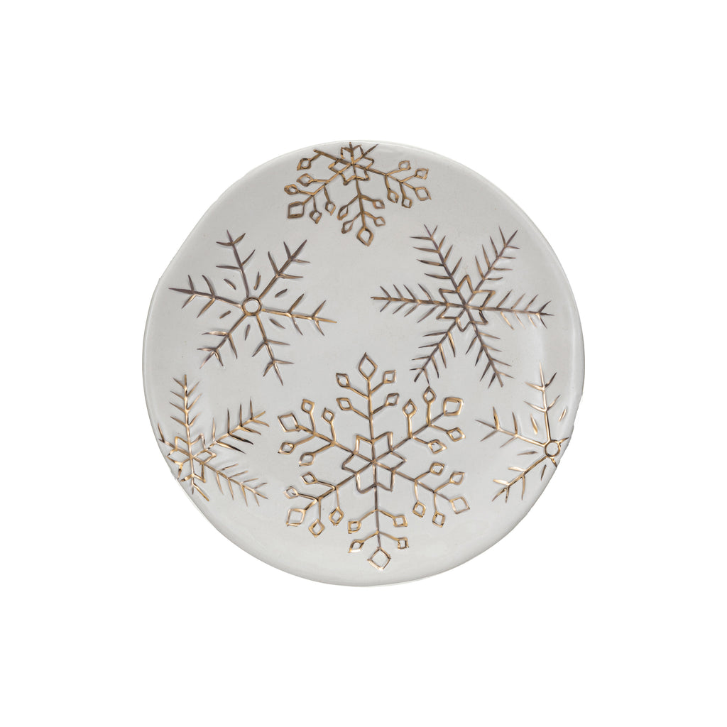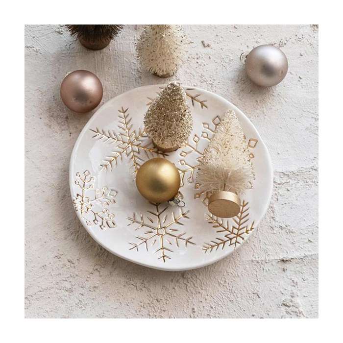 This festive stoneware plate features a white and gold design with sparkling gold electroplated snowflakes, adding elegance and charm to any space. Durable and easy to clean, it is versatile enough to use as a serving plate, wall décor, or display piece. Perfect for everyday meals or special occasions, it brings a touch of winter sophistication to your home.