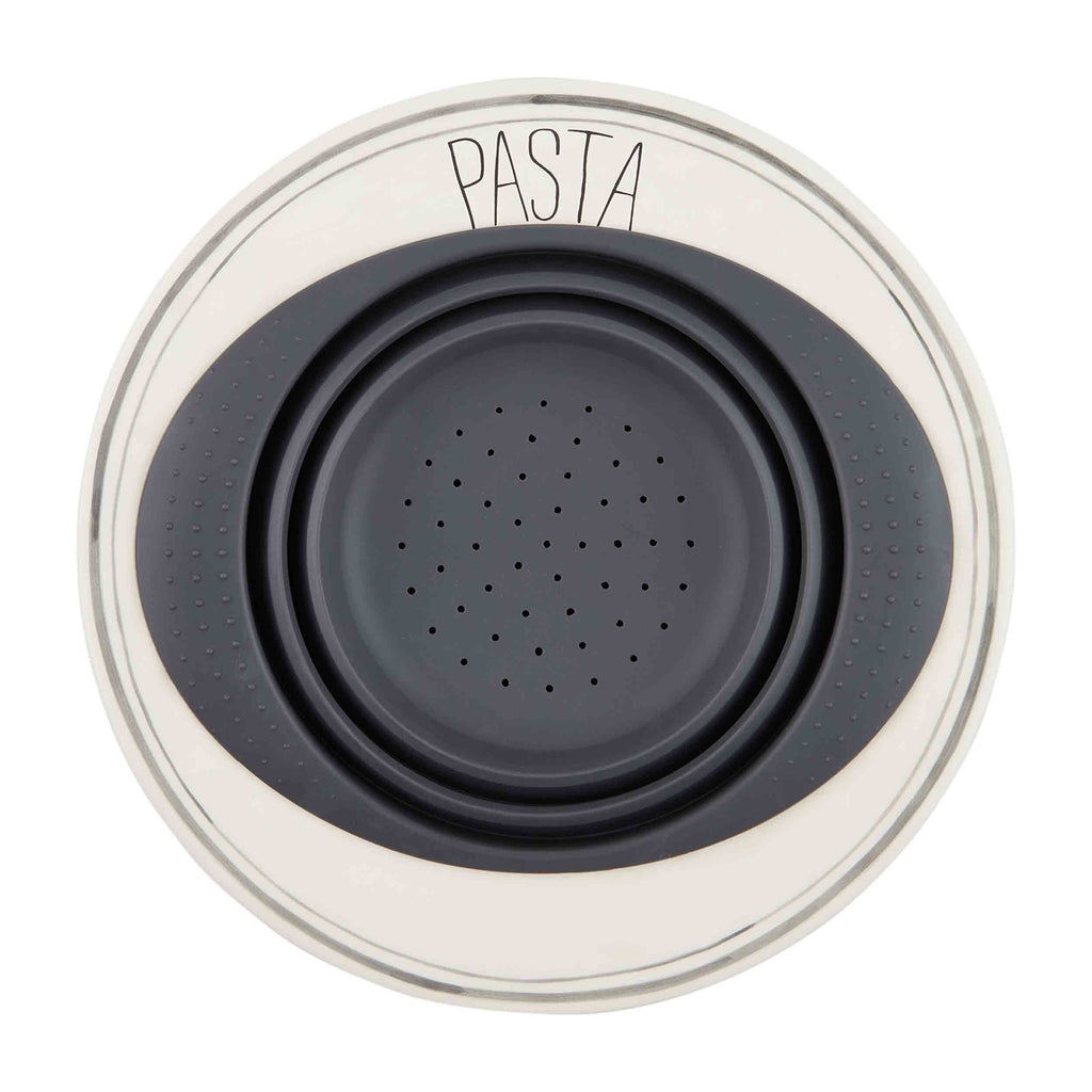 - The bowl pairs with a blue with collapsible silicone colander for pasta straining.