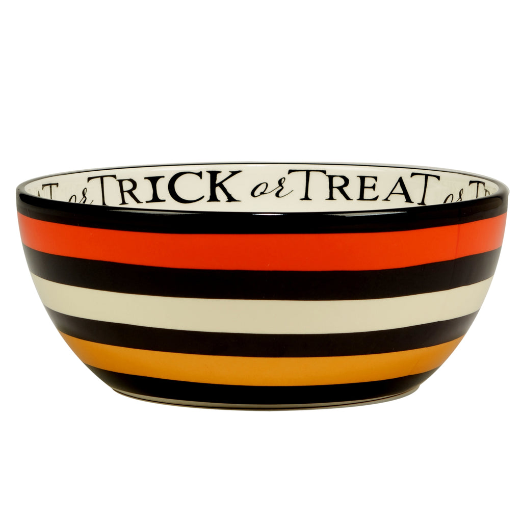 This Spooky Halloween Deep Bowl by Certified International is the perfect addition to your festive decorations. Its 10in x 4in size makes it ideal for serving up heaps of candy to trick-or-treaters or for dishing out Halloween-themed treats at your next party. The bowl features bold, horizontal stripes in the quintessential Halloween palette of black, orange, and white, which will complement any spooky decor. The playful "Trick or Treat" text around the inner rim adds a whimsical touch, inviting guests to dig in. Crafted with quality materials, this bowl isn't just for show it's built to last, ensuring you can enjoy its charm year after year. Whether you're hosting a ghoulish gathering or simply looking to add a touch of Halloween spirit to your home, this bowl is sure to delight.