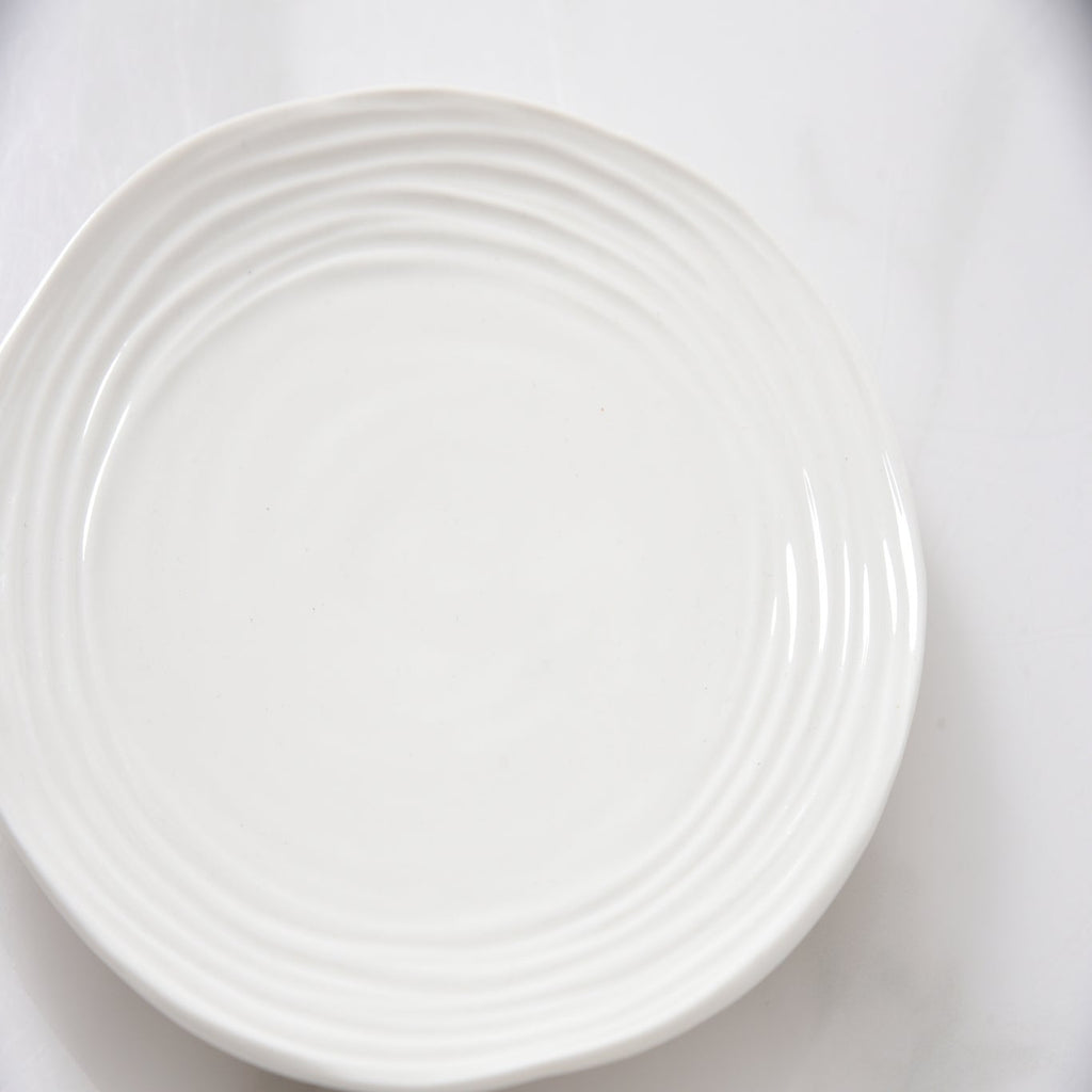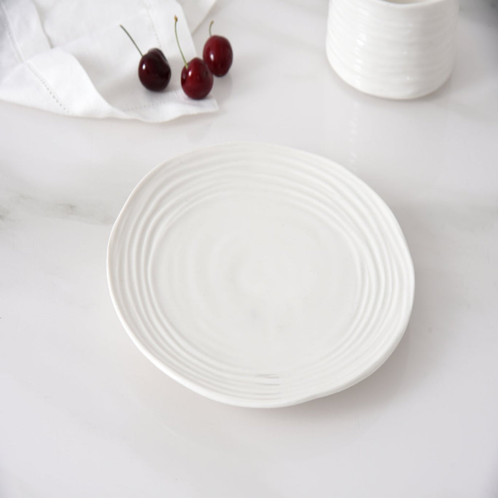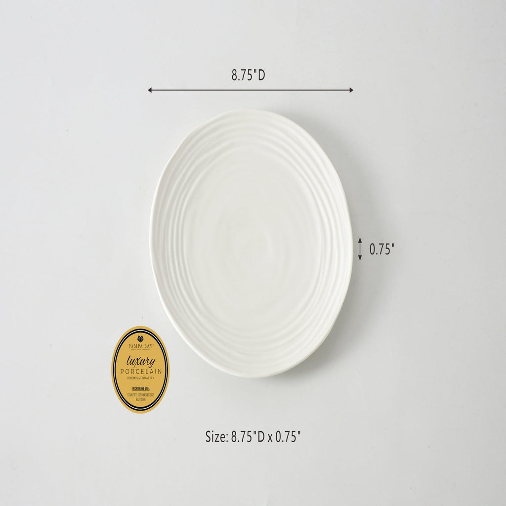 Round Salad Plate from our Le Blanc collection. Adds a touch of style to fancy dinners or everyday meals. Perfect for serving salads, appetizers or desserts. Artfully crafted this salad plate highlights the beauty of simplicity with clean lines and organic shapes. Versatile high-fired porcelain pieces that are microwave safe! Food safe, dishwasher safe, oven safe to 500°. Tarnish and stain-free. Easy Care.
