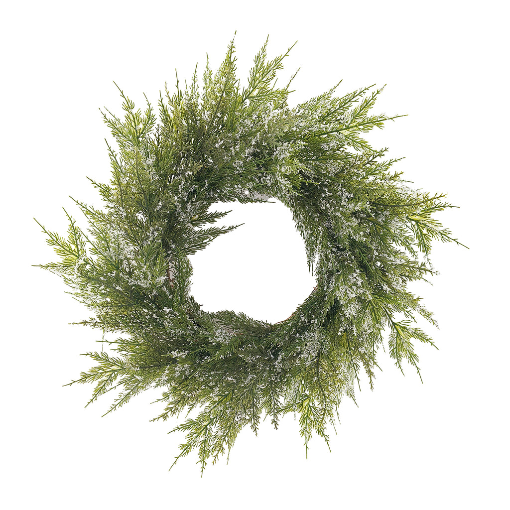 Embrace the beauty of winter with this 24" Cedar/Snow Frosty Wreath. Featuring realistic cedar branches lightly frosted with snow, this wreath adds a natural, wintry charm to your holiday décor. Perfect for front doors, mantels, or walls, it creates a serene, festive atmosphere both indoors and in covered outdoor spaces. A timeless seasonal accent you'll enjoy year after year.