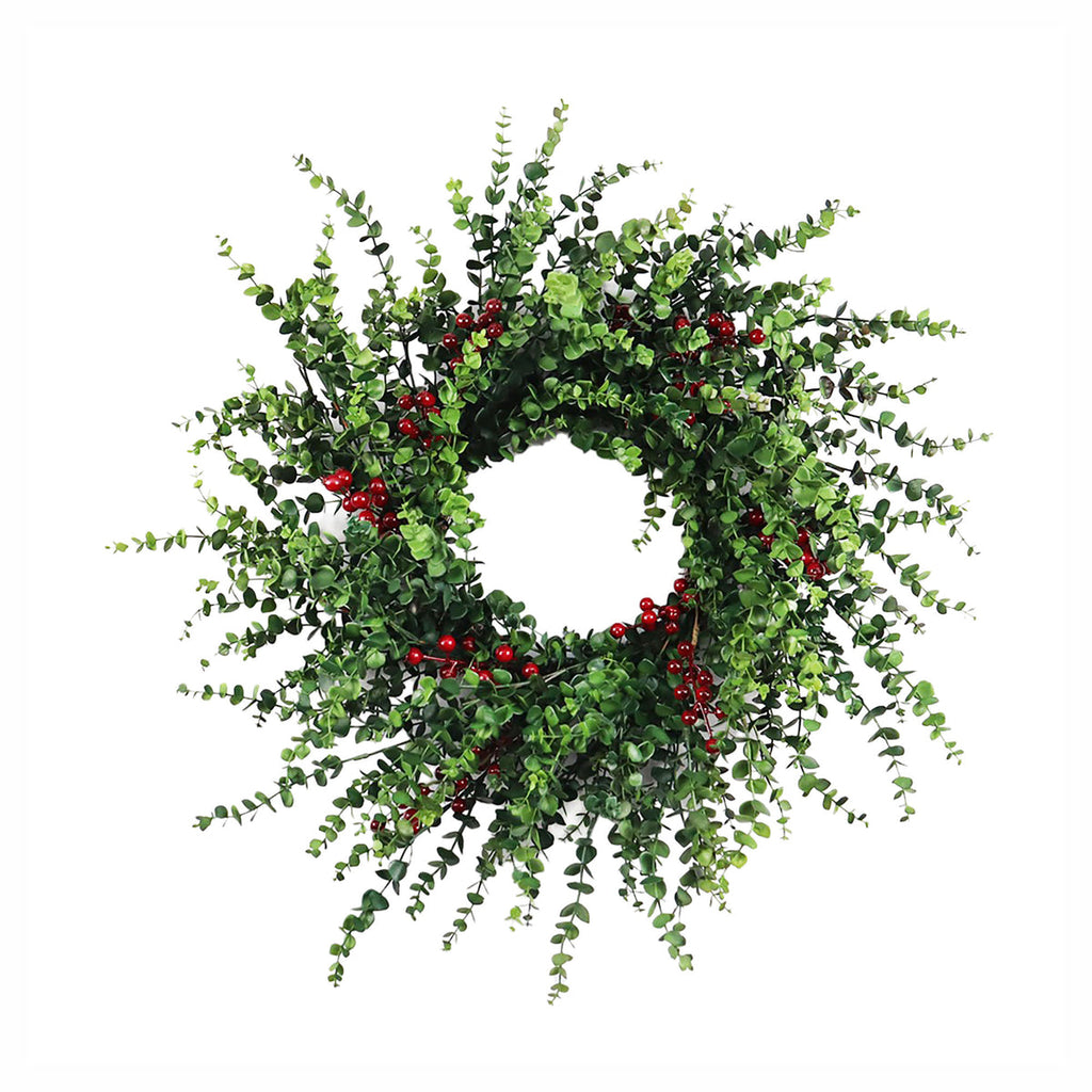 Add a festive pop of colour to your space with this 24" Red Berries Eucalyptus Mini-Leaf Wreath. Featuring delicate eucalyptus-style leaves and vibrant red berries, this wreath offers a modern twist on traditional holiday greenery. Its natural look and elegant design make it perfect for doors, walls, or mantels. Suitable for indoor or sheltered outdoor use, it’s a beautiful seasonal accent that brings warmth and cheer all winter long.