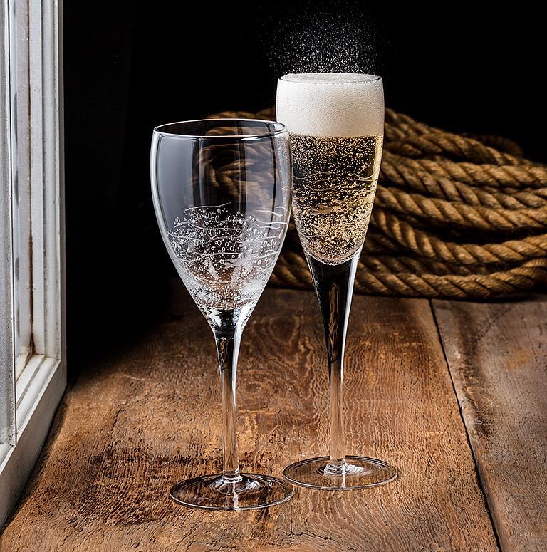 A play of bubbles and etched fish make this mouthblown goblet truly one of a kind! Perfect for anytime of year celebrations!