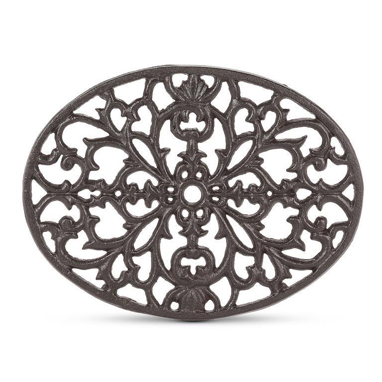 Add a touch of vintage elegance to your kitchen with this 9.5" cast iron Oval Filigree Trivet. The ornate cutout pattern blends timeless sophistication with practical functionality, making it a perfect heat-resistant surface for hot pots, pans, and serving dishes.