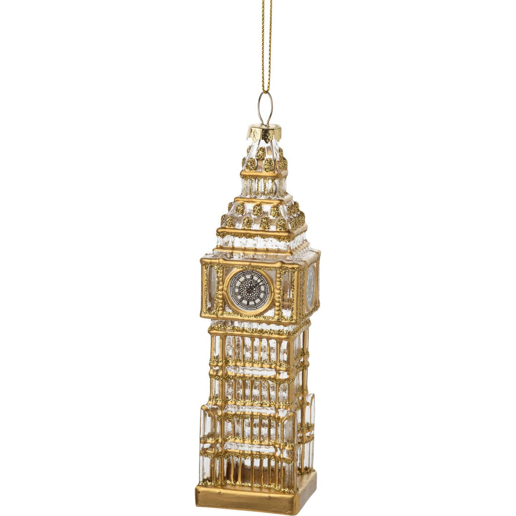 This elegant Glass Big Ben Ornament features a clear glass design accented with fine gold detailing, creating a timeless holiday keepsake. It adds a touch of classic charm to any tree or décor display.