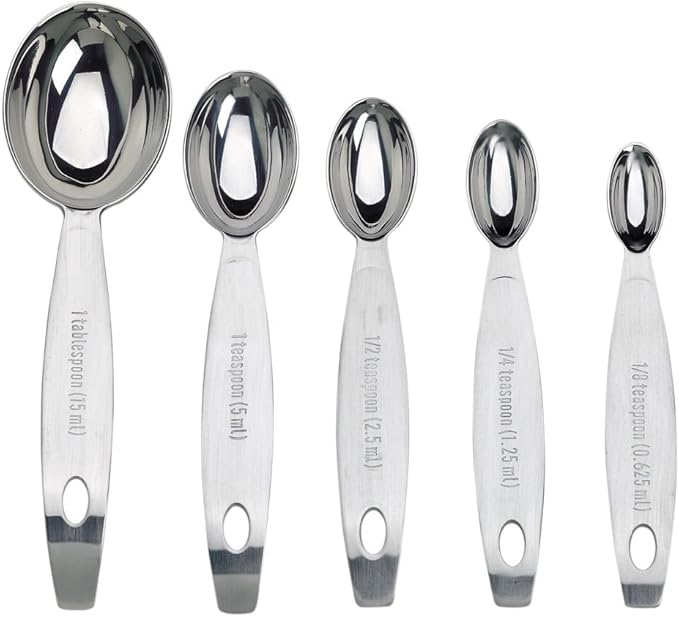Recommended by professionals, our innovative set of five measuring spoons fit together neatly and are held together with a simple storage clip. These superb nesting measuring spoons are oval so you can reach into the smallest spice jar.