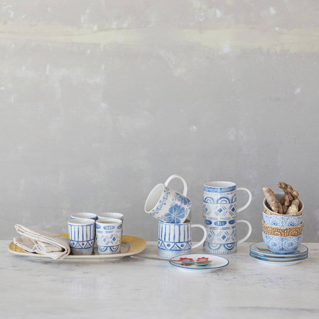 This 3-1/2" Round x 3-1/2"H Stoneware Mug holds 14 oz. and features a beautiful blue and white tile pattern. Available in 4 unique styles, it's perfect for sipping your favorite beverages while adding a touch of elegance to your kitchen or dining table. Durable and stylish, this mug is a must-have for any collection.