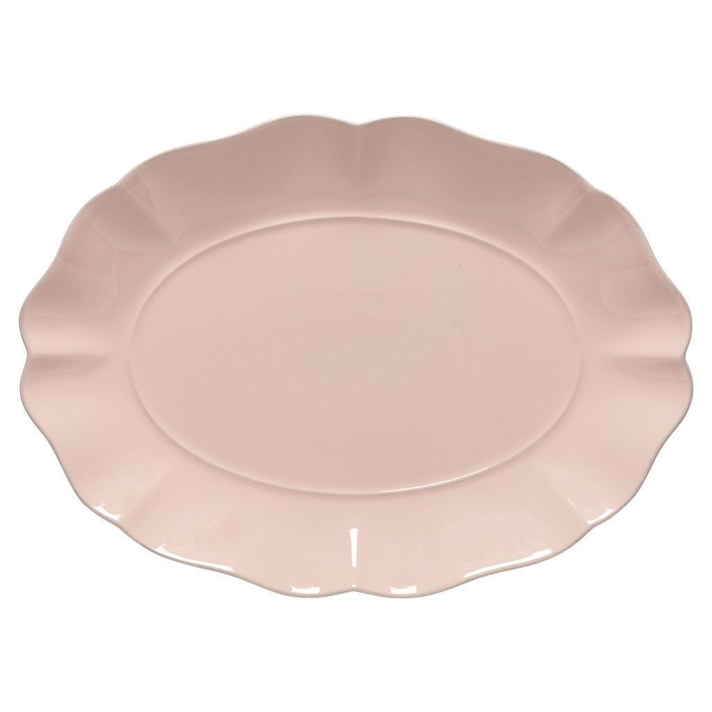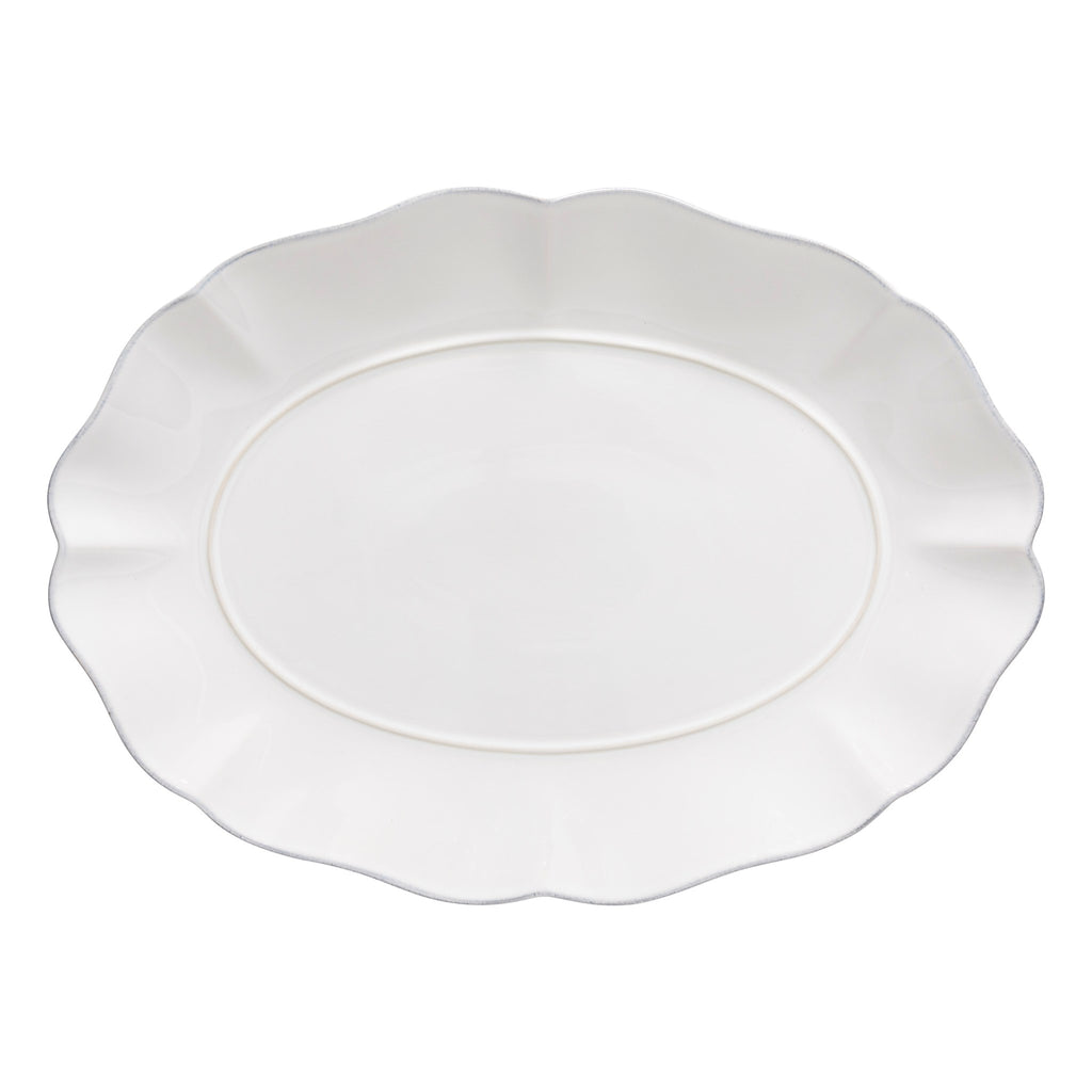 The Rosa Oval Platter, made from fine stoneware and crafted in Portugal, features a glossy glaze with a unique finish. The hand-painted rim enhances the delicate cutouts and graceful silhouettes, giving it a modern touch.