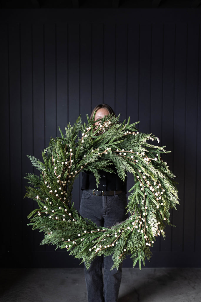 White Plum Berry Norfolk Cypress Real Touch Wreath by Luxe B Co. is our high-quality, realistic "Real Touch" holiday decoration. Natural Touch technology makes the Wreath look realistic by giving it a lifelike appearance and feel. Luxe B Co. offers a variety of holiday decoration products, including Norfolk Pine Wreaths, Norfolk Pine Stem Picks, Vintage Bells, and Velvet Ribbons. These items can further complement your holiday decor. Real Touch technology (advancement in the Faux Flower and greenery industry for a realistic look and feeling ) White Plum Berry Norfolk Cypress Real Touch Wreath branches can be easily maneuvered for styling.