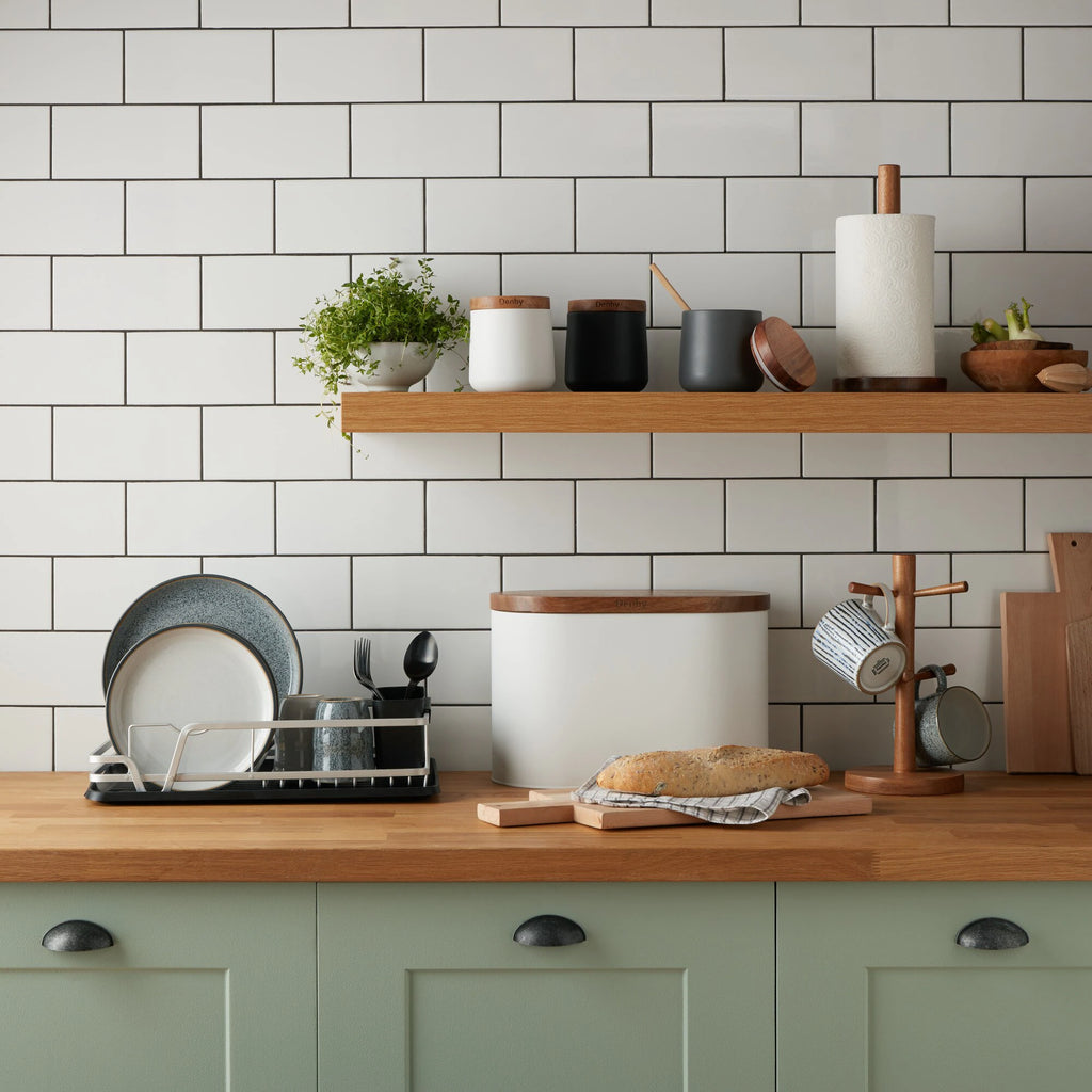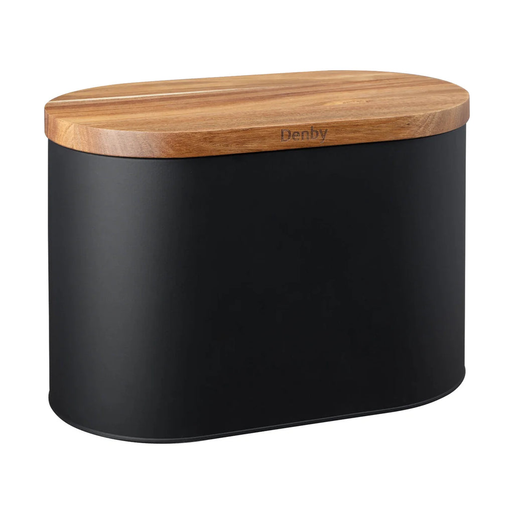 A stylish bread bins in White and black crafted from Galvanized Steel with a contemporary matt finish. Complete with an Acacia wooden lid which can double up as a handy chopping board. The stylish design matches other items in the Denby Kitchen range.