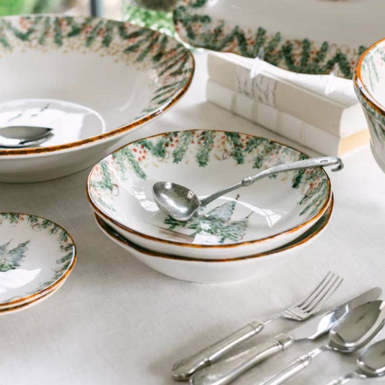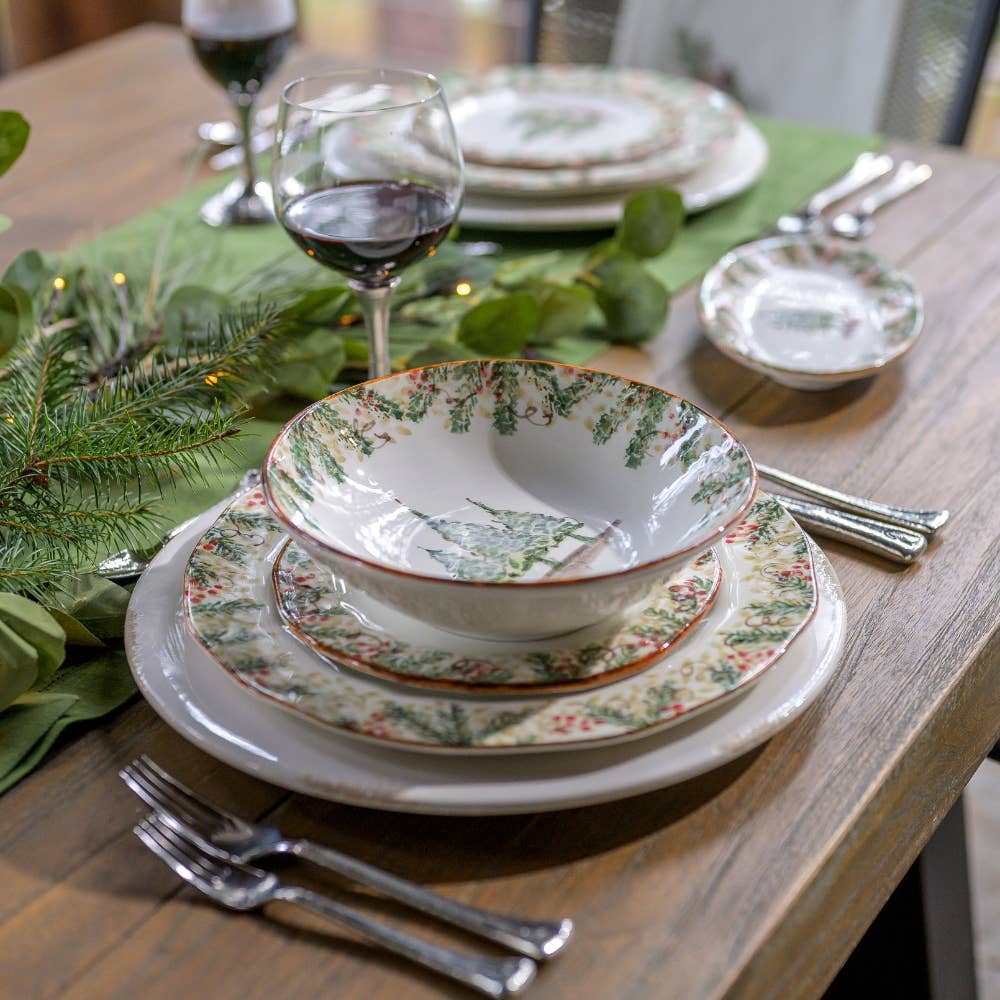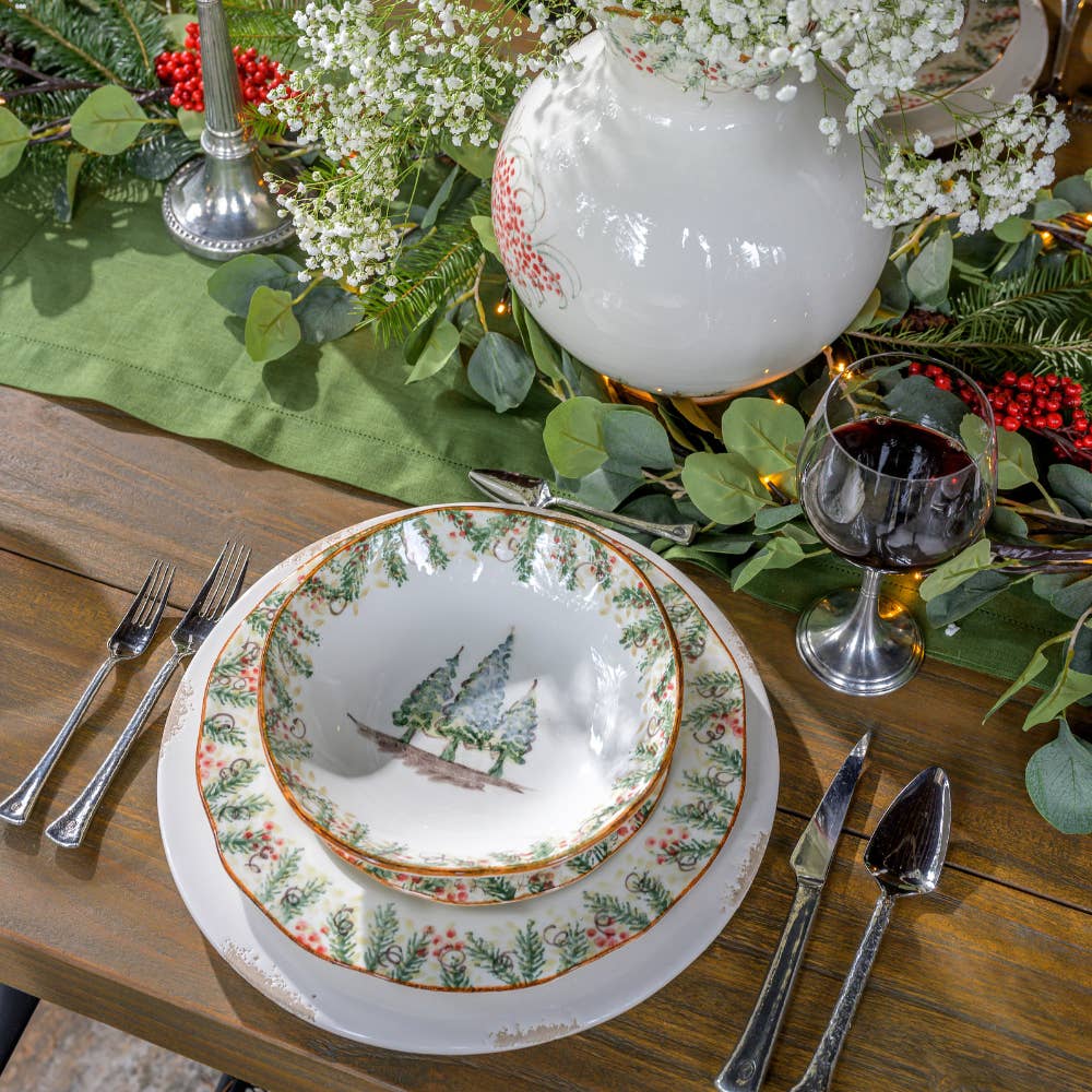 Our best selling Natale Collection is one of the most popular lines in the industry. Festive, yet soft, it features majestic snowy evergreens surrounded by enchanting pine boughs and winterberries. All hand painted, no two pieces are alike. Customers love its "wintery" look, perfect for Christmas celebrations but so beautiful throughout the winter season. Handmade and hand painted in Tuscany. Dimensions: 9 inches diameter 2.5 inches height