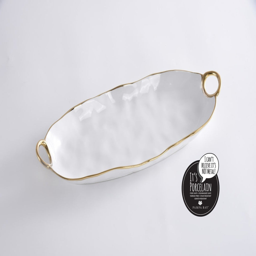 • Gleaming white porcelain serveware with smooth and graceful handles, hand-finished in gold titanium