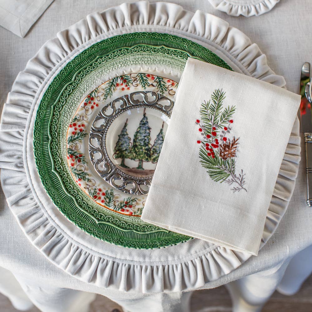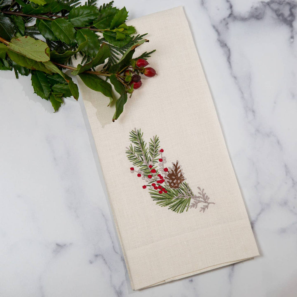 Dress up that kitchen or bath with this beautiful 100% European linen embroidered towel with this elegant piece designed to complement the timeless Arte italica "Natale" collection. Machine wash and iron flat for a crisp look. Measures 17"x29".