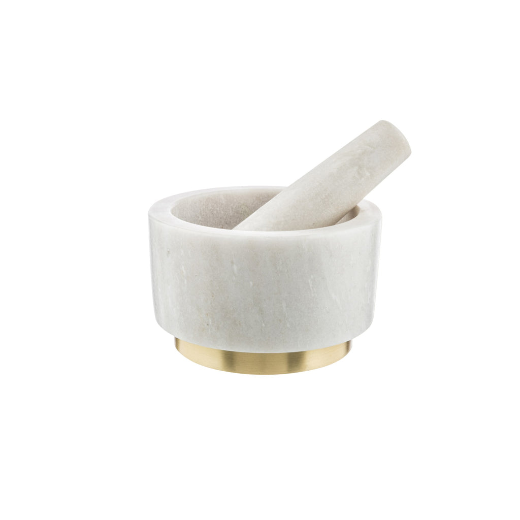 • Premium quality natural white & grey marble that is designed to last! Shaped to fit perfectly in the hand, the set is accented with a brass base making it a lovely décor piece for open pantry shelves