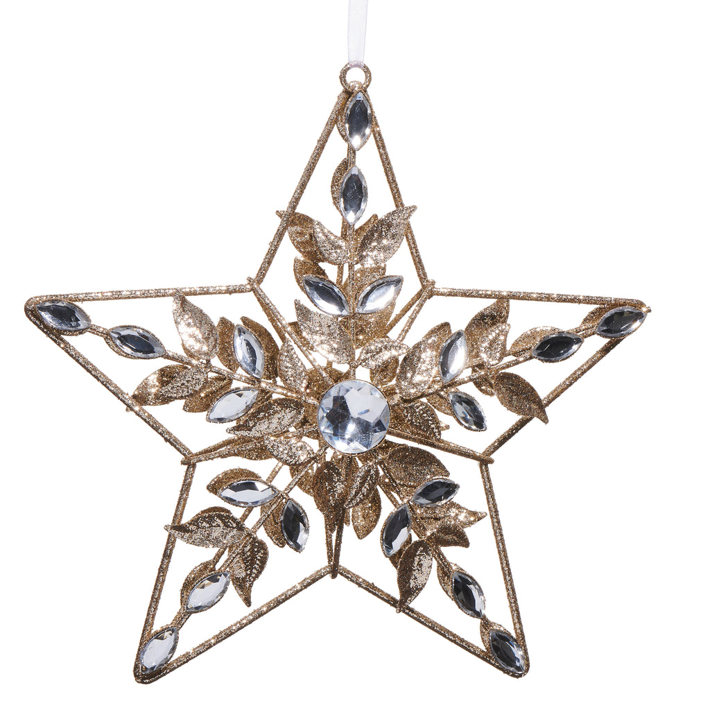 Bring sparkling elegance to your holiday décor with this 8.5" clear jewelled star ornament, crafted from metal. Perfect for Christmas trees, garlands, or festive displays, it adds a shimmering focal point to any space.