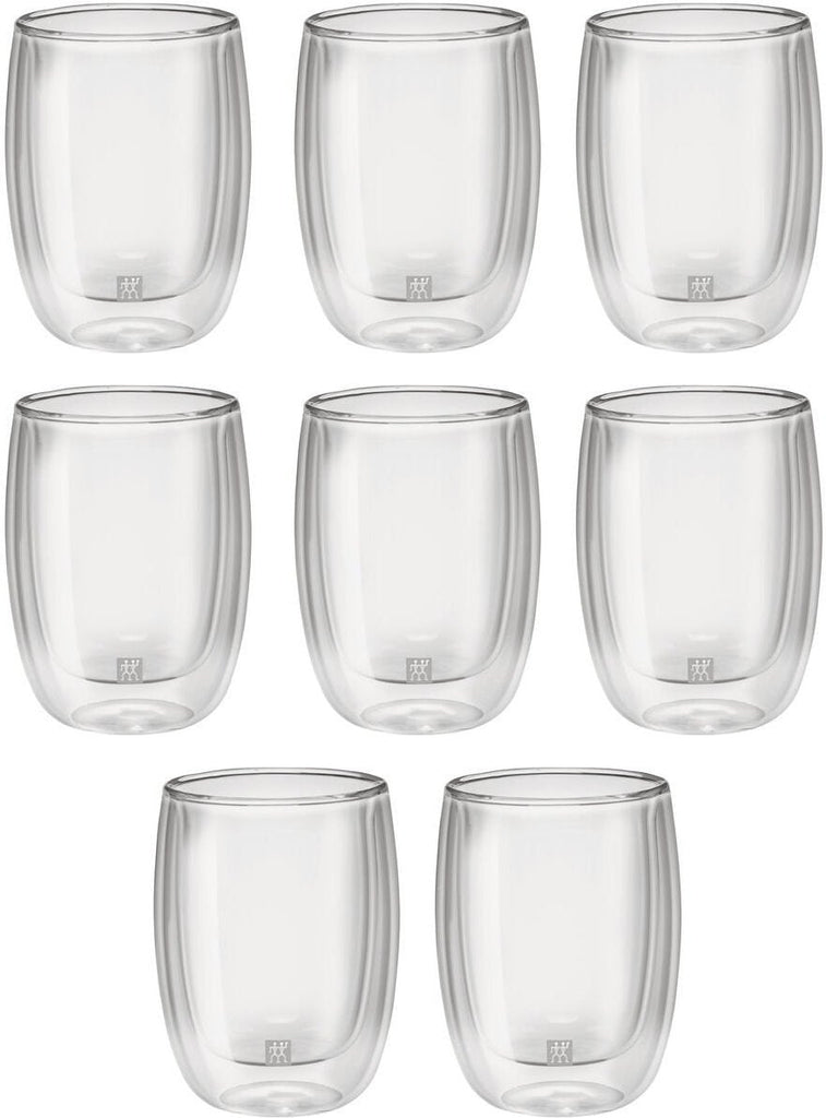 This set consists of 8 borosilicate double walled glasses with a capacity of 200ml each. This material is insensitive to temperature fluctuations and is therefore ideal for both hot and cold drinks and is light yet strong. Each glass has perfect functionality, keeping hot drinks hot and cold items cold.